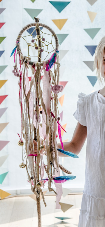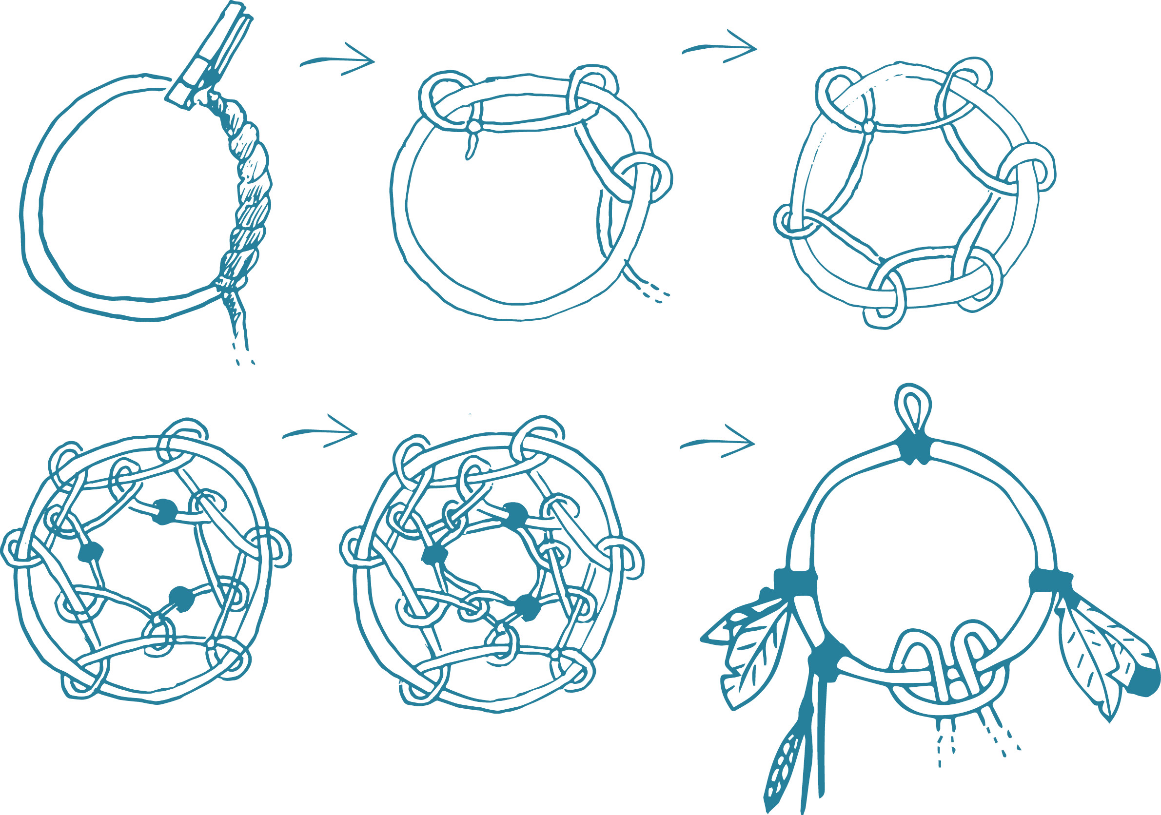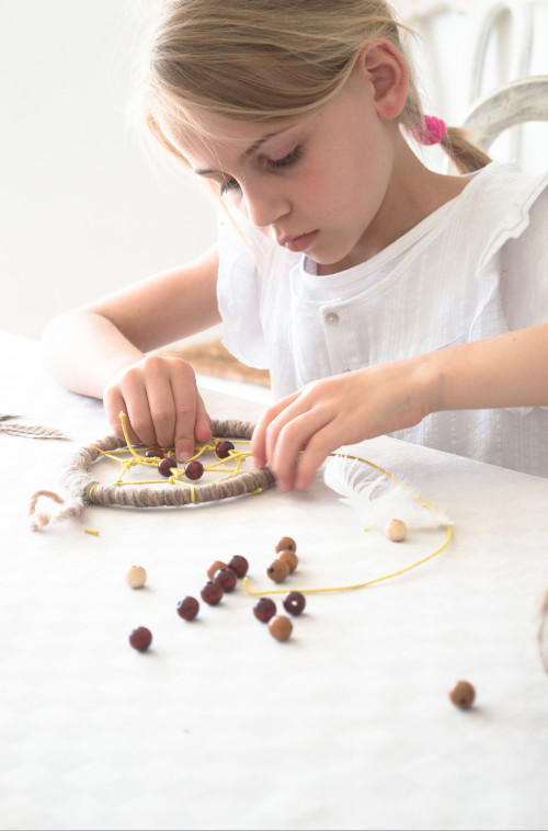 Pour le construire, rien de plus facile avec des enfants à partir de 6 ans. Commencez par enrouler un fil de laine ou un ruban autour de l’anneau en bois. Suivez ensuite les étapes ci-dessous. Cet attrape-rêve comprend 6 nœuds par tour de l’anneau, mais il est aussi possible d’en faire davantage selon les envies de son créateur.